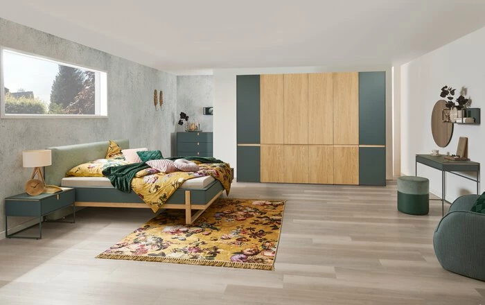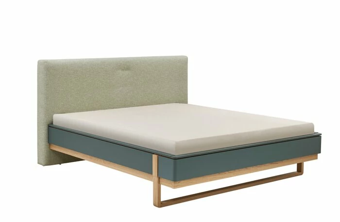 - Bettrahmen aus Spanplatte mit Lack in salbeigrün matt, Absetzungen aus furnierter Eiche natur