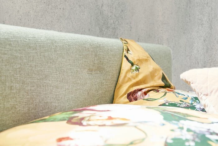 - Mit Polsterkopfteil im Stoffbezug in salbeigrün