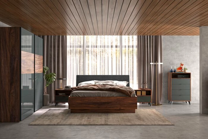 - Aus Spanplatte mit hochwertiger Dekorfolie in Nussbaum Brera, Absetzung in Hochglanz Grau