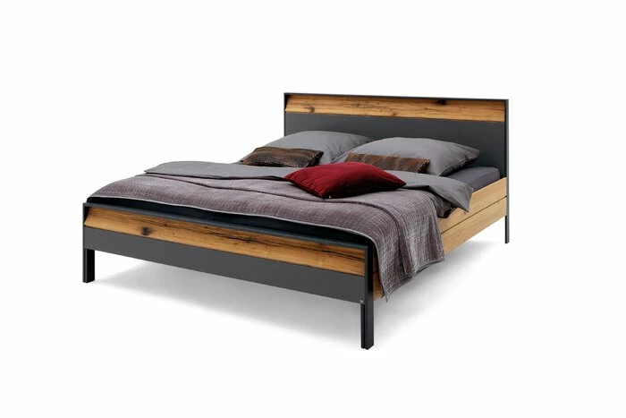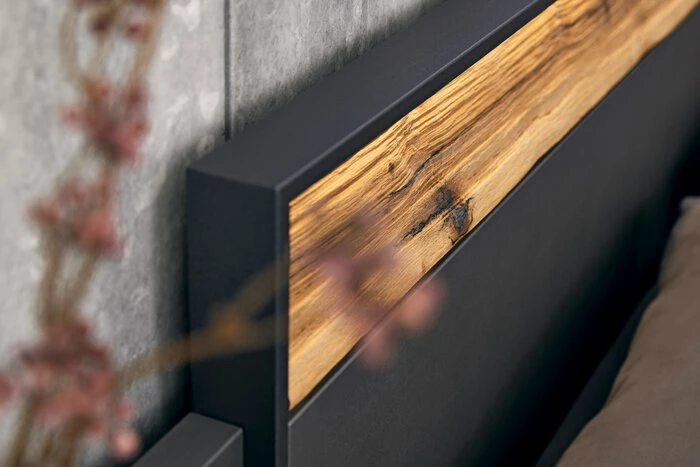- Kopf- und Fußteil aus Spanplatte mit Lack in graphit, Absetzungen in Spaltholz