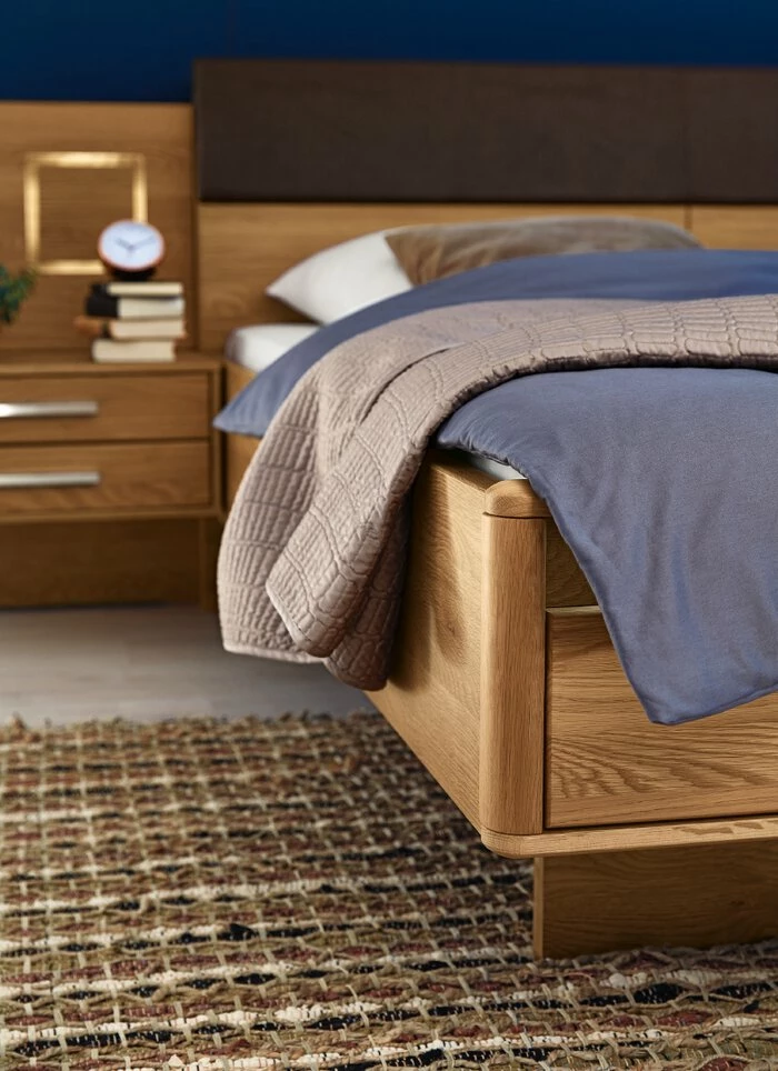- Untergestell und Bettrahmen aus Spanplatte mit Dekorfolie in Eiche