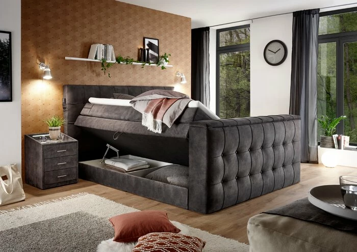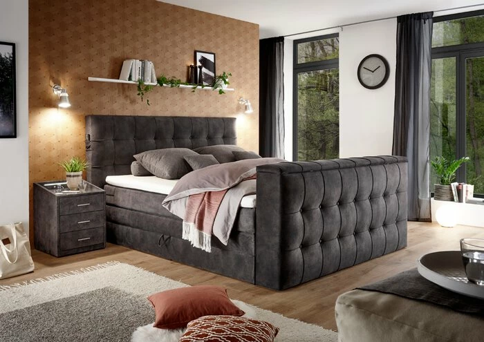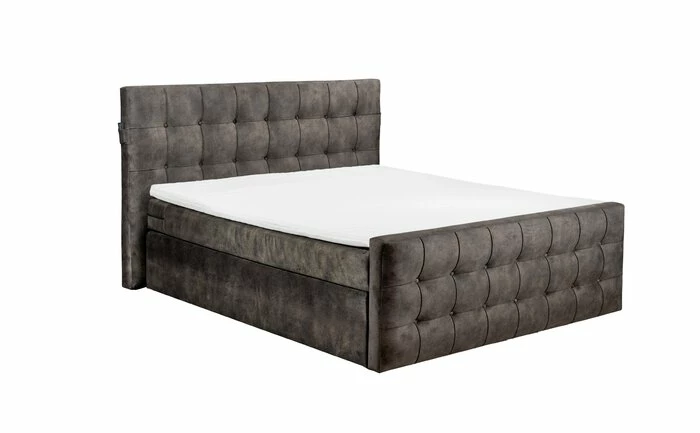 - Boxunterbau aus Holzwerkstoff (HDF) mit 4-Gang-Bonellfederkern, bezogen in Stoff Espresso