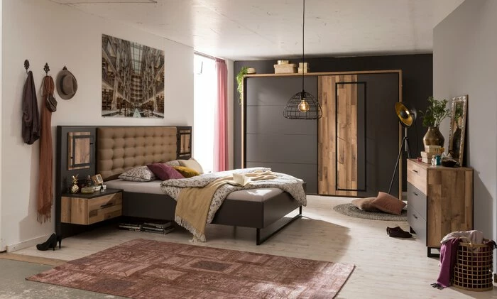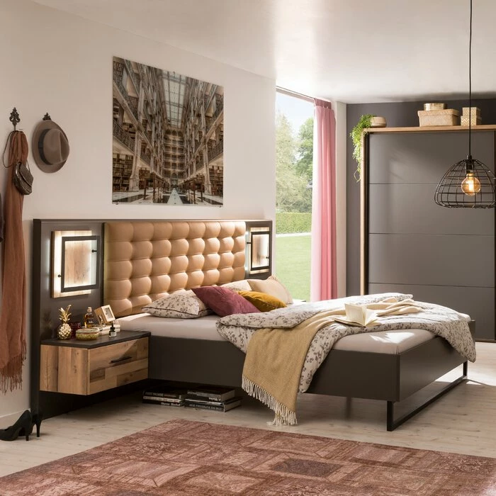 - Kopfteil aus Stabeiche kombiniert mit Wolfram grau, gepolstert mit Öko-Leder in braun