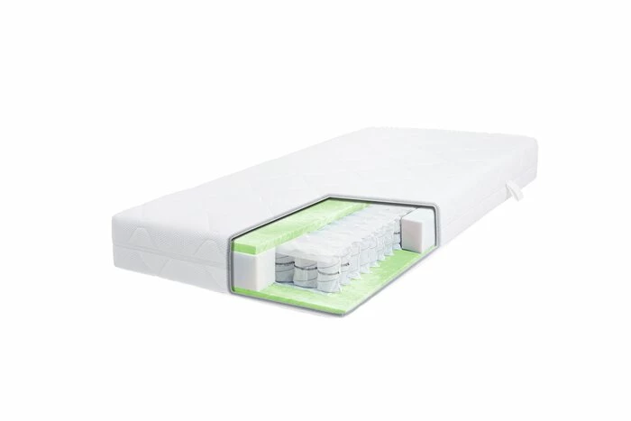 - Matratze mit punktelastischem 7-Zonen Federkern mit ca. 150 Federn/m², Komfortschaum-Abdeckung mit 2 x ca. 2,4 cm, RG 30