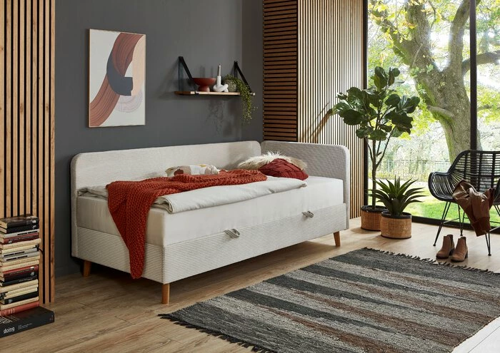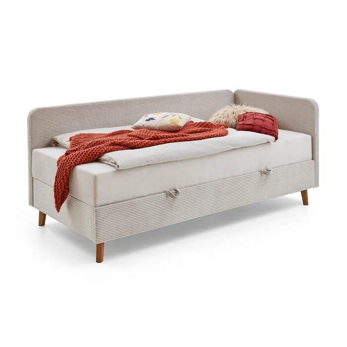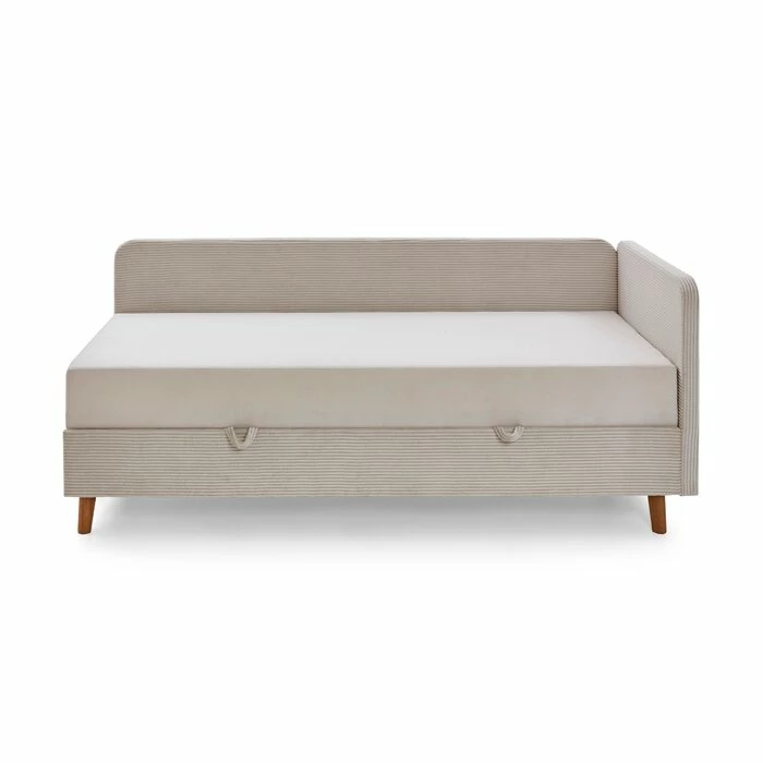 - Bettgestell aus Holzwerkstoff, Füße aus Massivholz in eichefarbig, Bezug aus Cord-Stoff in beige