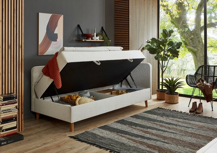 - Inkl. Bettkasten seitlich klappbar, Kopfteil links und rechts montierbar