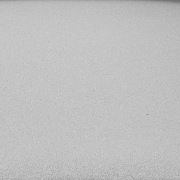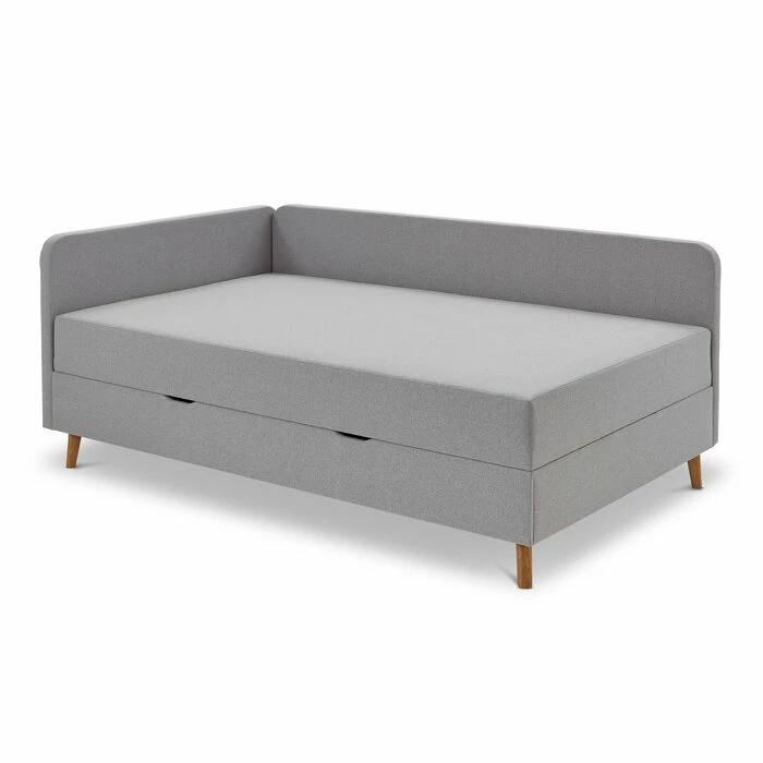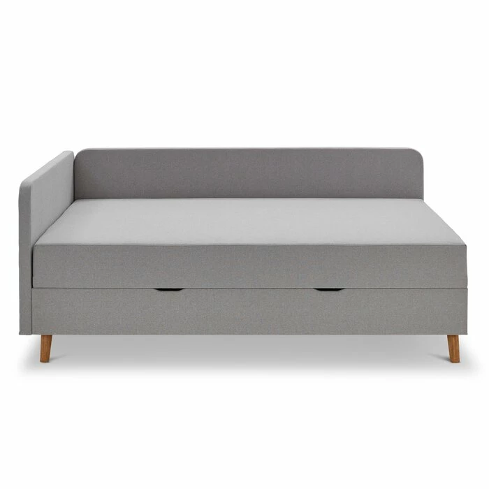 - Bettgestell aus Holzwerkstoff (Spanplatte), Füße aus Massivholz in eichefarbig, Bezug aus Stoff in grau