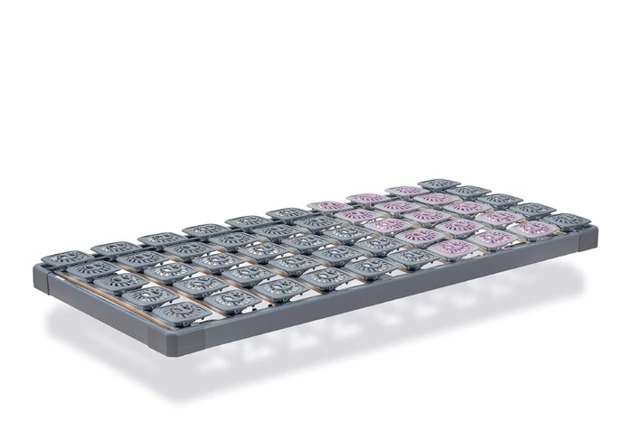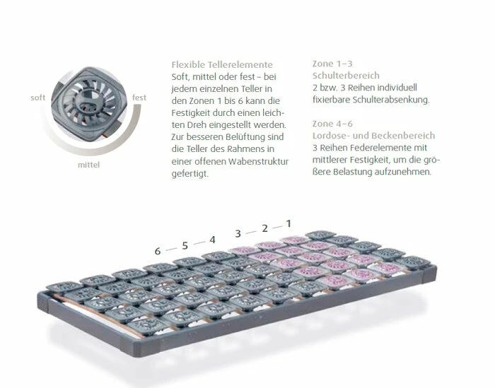 - Federelemente mit mittlerer Festigkeit im Lordose- und Beckenbereich, um die größere Belastung aufzunehmen, mit individuell fixierbarer Schulterabsenkung