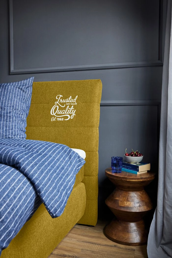 - Gestell aus Holzwerkstoff mit Stoffbezug in curry, inkl. Tom-Tailor-Druck am Kopfteil